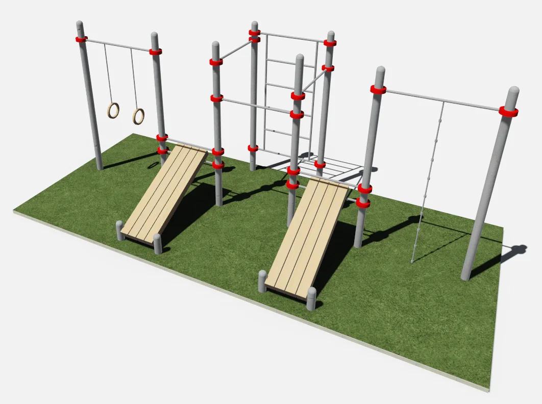 Составляющими данного комплекса являются шведская стенка, две скамьи для пресса, турники для подтягиваний, два турника классических для фиксации колец и каната.