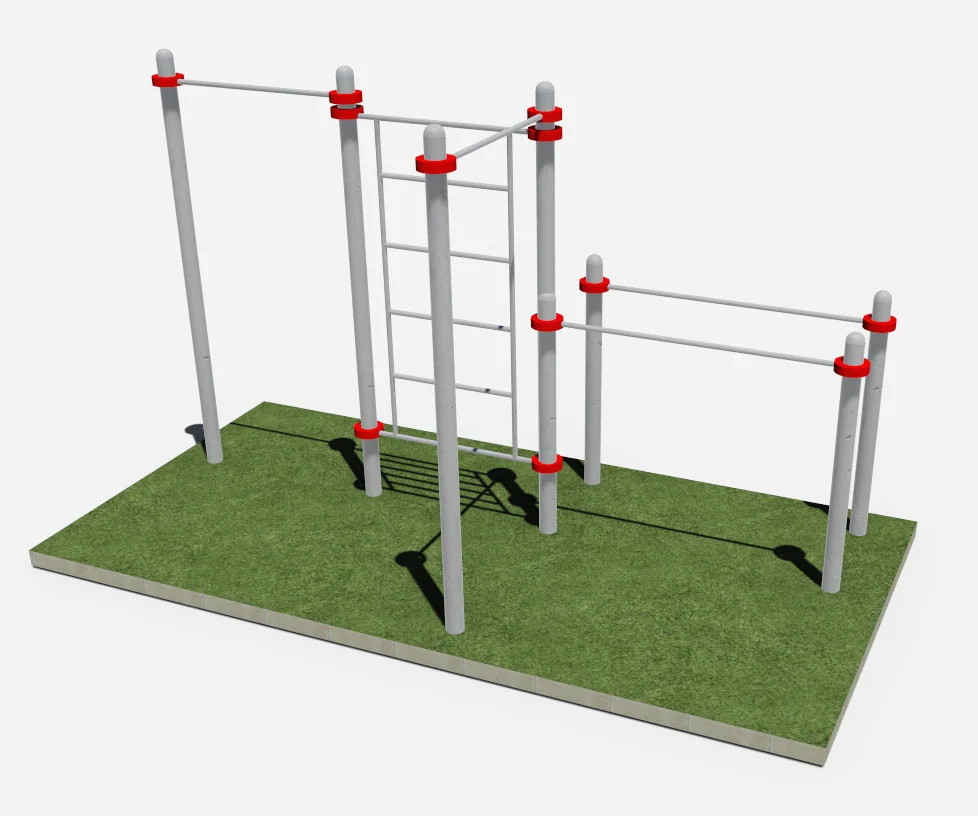 К опорным столбам высотой 2600мм в количестве 4 единиц крепится на высоте от уровня основания: 2450 мм – перекладины турников, 2300 мм- шведская стенка.